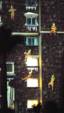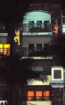 At 7:30 pm, to the sound of soaring holiday music, 15 virtual elves climbed the hotel, and transformed this Hawaiian landmark to a magical Christmas wonderland - complete with lights, ornaments, wreaths, icicles, an ancient stone facade and, of course, snow.